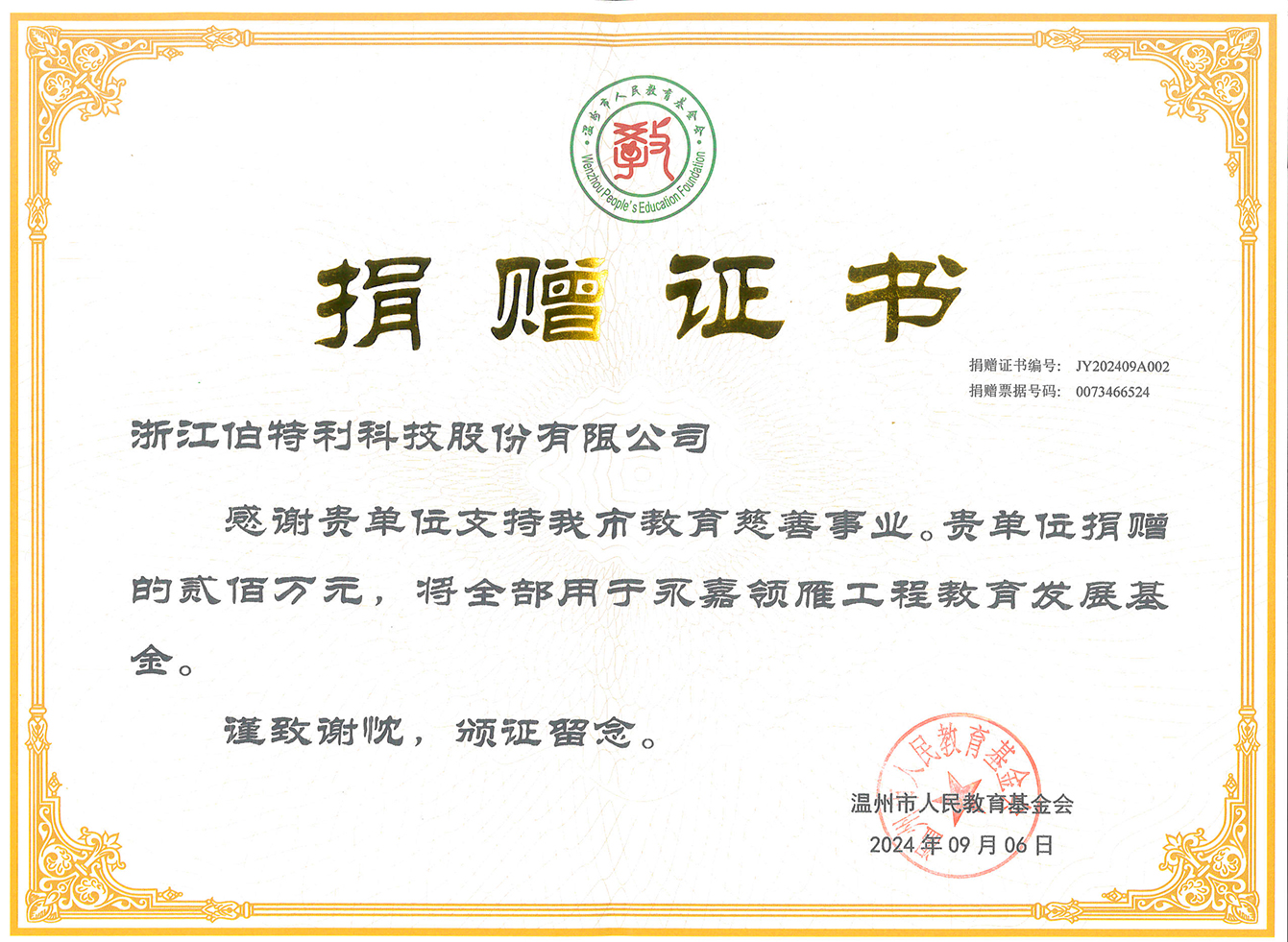 千秋基业,人才为本;十年树木,百年树人。为贯彻落实党的二十大精神以及习近平总书记的重要指示精神,全力建设高素质专业化校长队伍,教师节前夕,2024 年 9 月 6 日下午,温州市人民教育基金会“永嘉领雁工程教育发展专项基金”签约捐赠仪式在温银大厦 1109 会议室隆重举行。捐赠签约仪式上,浙江伯特利科技股份有限公司捐赠1000万元,用于永嘉县教育系统优秀校长、优秀班主任、优秀教师三支队伍的奖励和建设,用实际行动支持永嘉教育事业优先发展,彰显企业家的社会责任与担当。