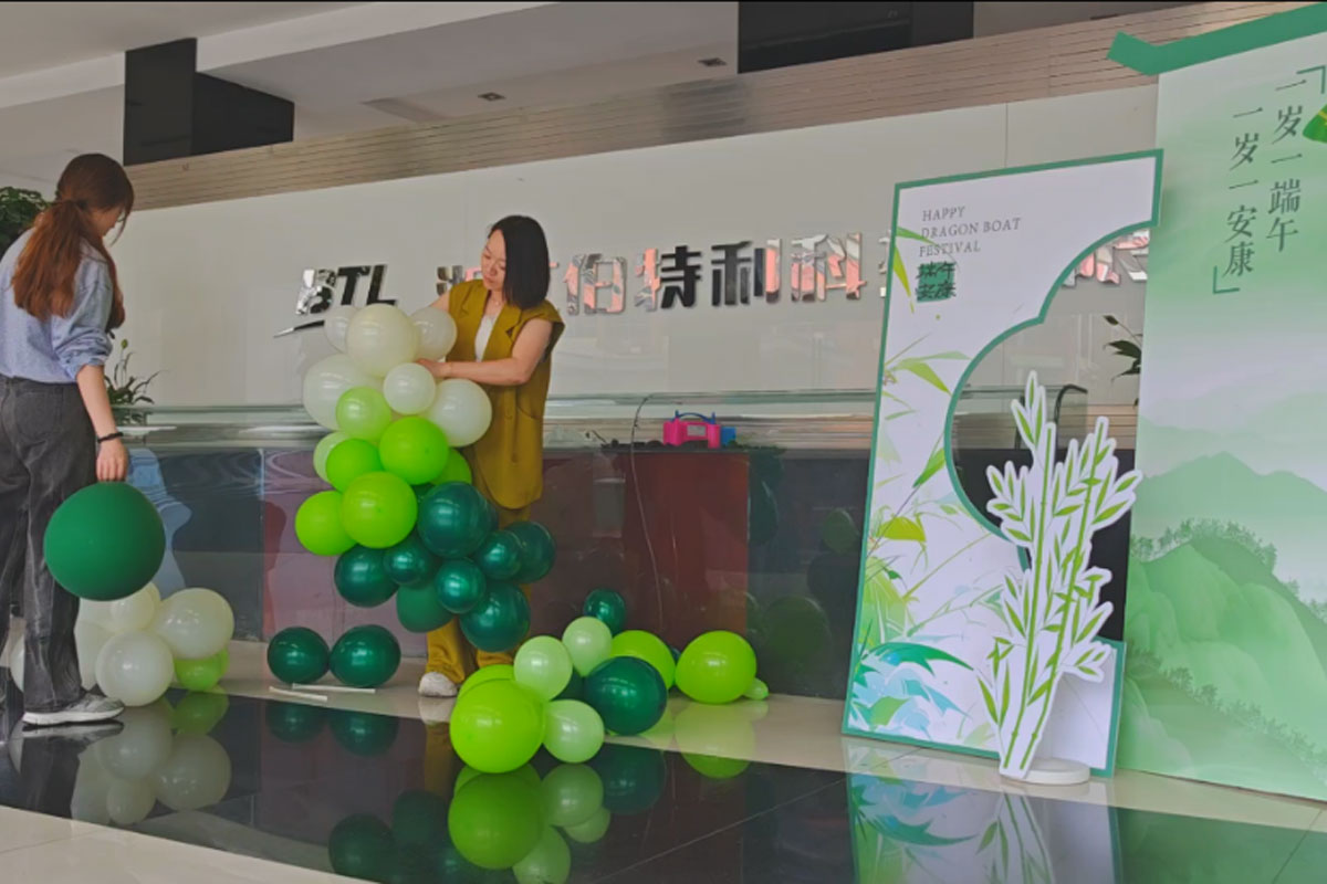 端午前夕,浙江伯特利科技股份有限公司人资行政中心便精心布置节日场景,办公楼内悬挂起绿色渐变色气球粽叶、摆放端午主题海报,公司大厅里洋溢着传统文化韵味,让员工未踏入公司便感受到浓厚的节日气息。