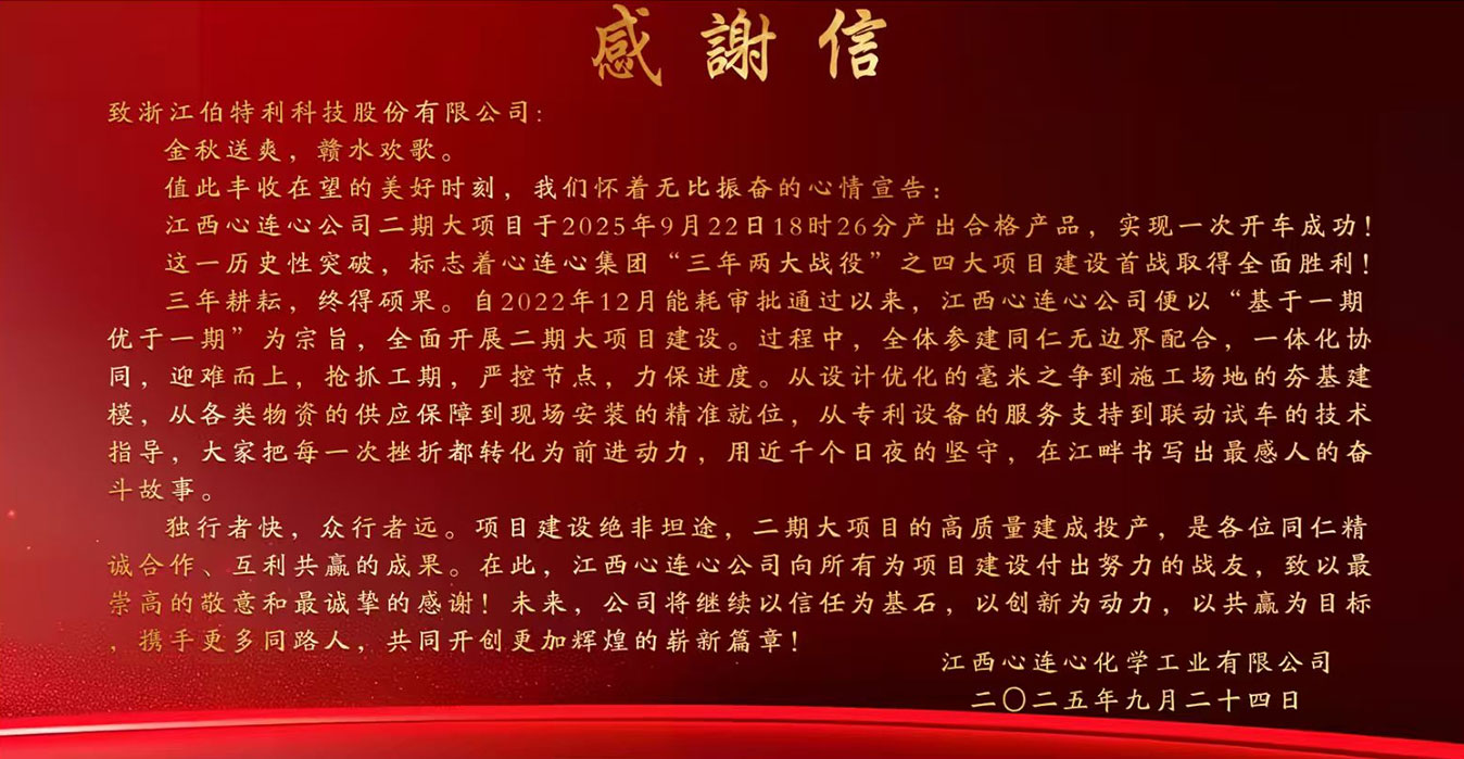 近日,浙江伯特利科技股份有限公司收到江西心连心化学工业有限公司(以下简称"心连心")发来的感谢信。信中,心连心对伯特利在二期大项目中提供的关键阀门产品表示高度认可,并特别感谢伯特利团队在技术攻关、物资保障及现场协同中的卓越贡献。